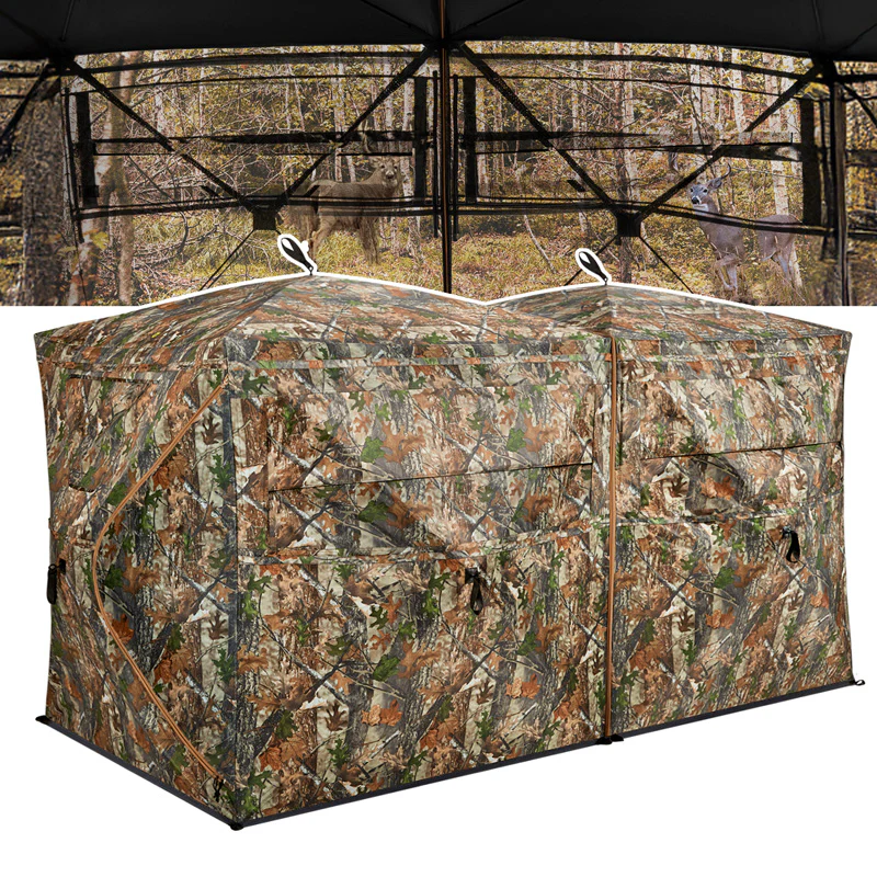- Extra Large Space & Double door design: Single hunting blinds dimensions: 66"height, hub to hub 75" x 75", and with a floor space of 58" x 58". This can comfortably accommodate two or three hunters. Combination hunting blinds dimensions: 66"height, hub to hub 132" x 75", and with a floor space of 116" x 58", which can comfortably accommodate four or six hunters. When the two blinds are combined, two full-length zippered doors are located on opposite corners for easy entry.